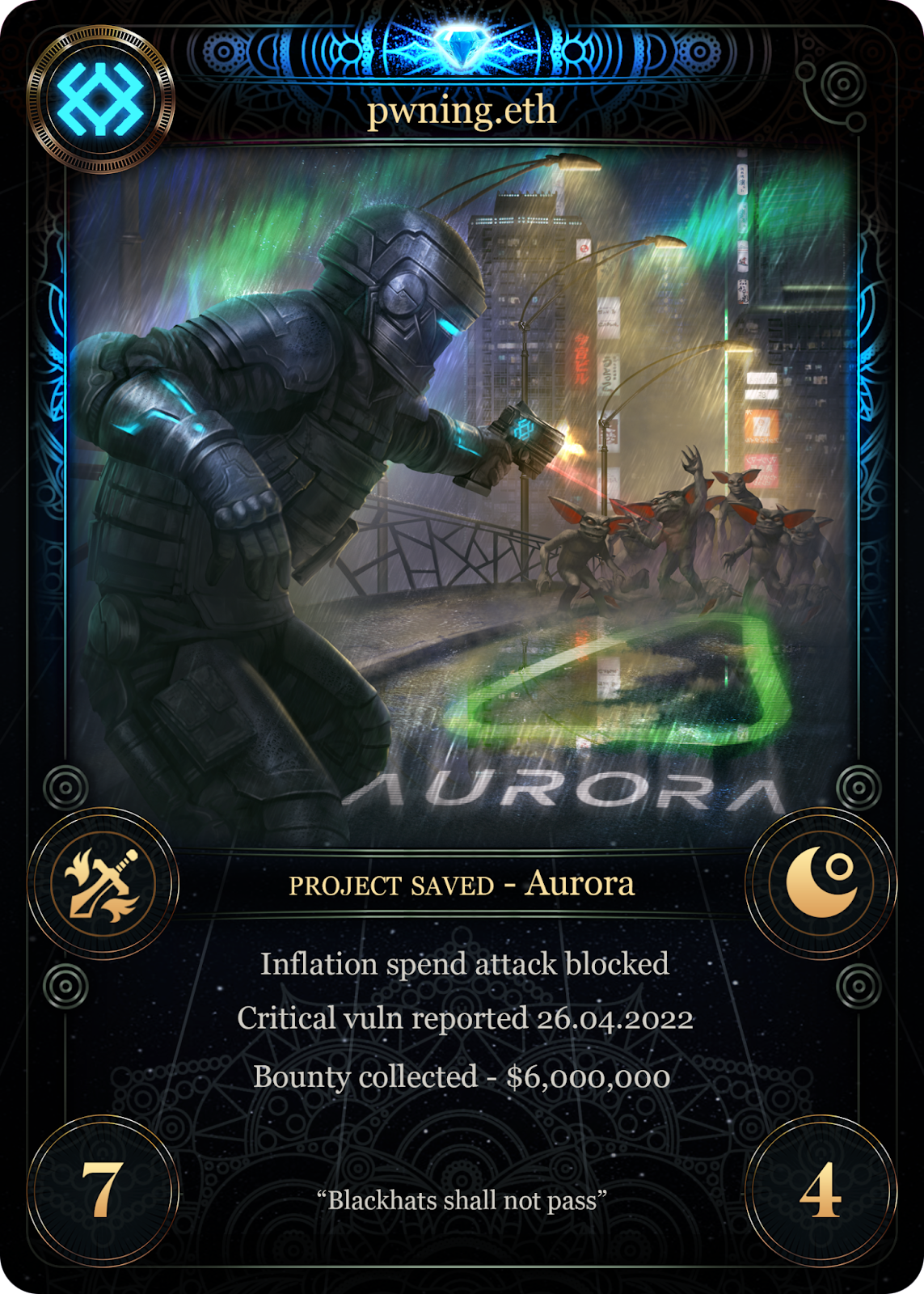 This time, we worked with an artist to show pwning.eth locked in struggle with bugs and blackhats on the Aurora bridge, with aurora borealis displayed overhead.