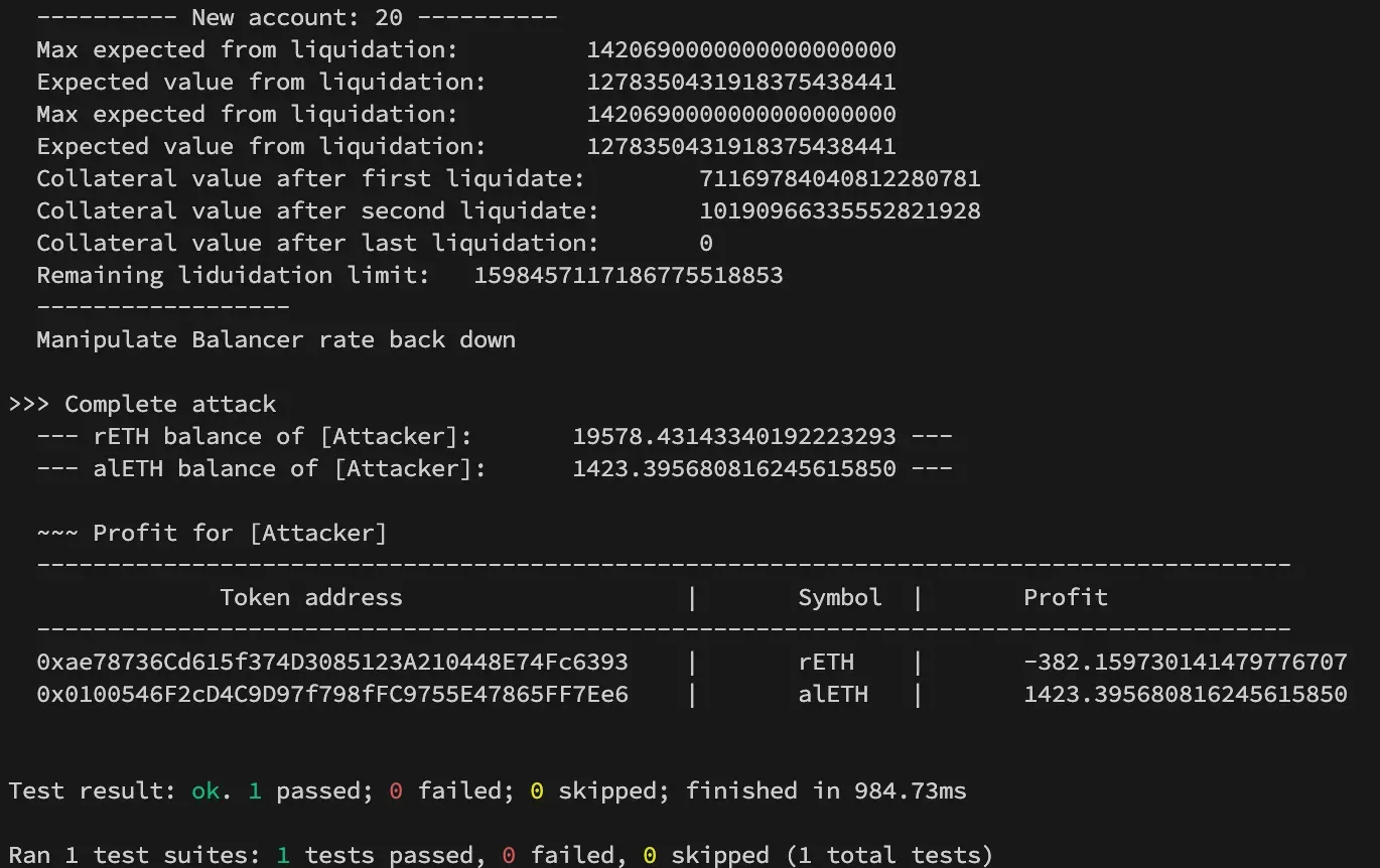 The Immunefi team prepared the following PoC to demonstrate the vulnerability. The attack first manipulates the Balancer pool which is utilized for the unwrapping of rETH in the Alchemix adapter. Then, 20 different accounts are utilized for the attack to bypass individual deposit limits. Each account deposits up to the limit, mints the maximum amount of alETH they can, and then liquidates their own position while the Balancer rate is manipulated. In the real attack, these transactions would need to be individually sandwiched with the Balancer manipulation since Alchemix does not allow non-whitelisted contracts to interact with the liquidation function. However, for simplicity, the PoC uses the single manipulation event to account for all liquidations. After borrowing with all accounts up to the limit and executing liquidations for each account until the collateral value is near zero, the attacker can now manipulate the balancer rate back down to recover the collateral deposited for each account, and is now left with the minted alETH, and original collateral (minus swap fees).