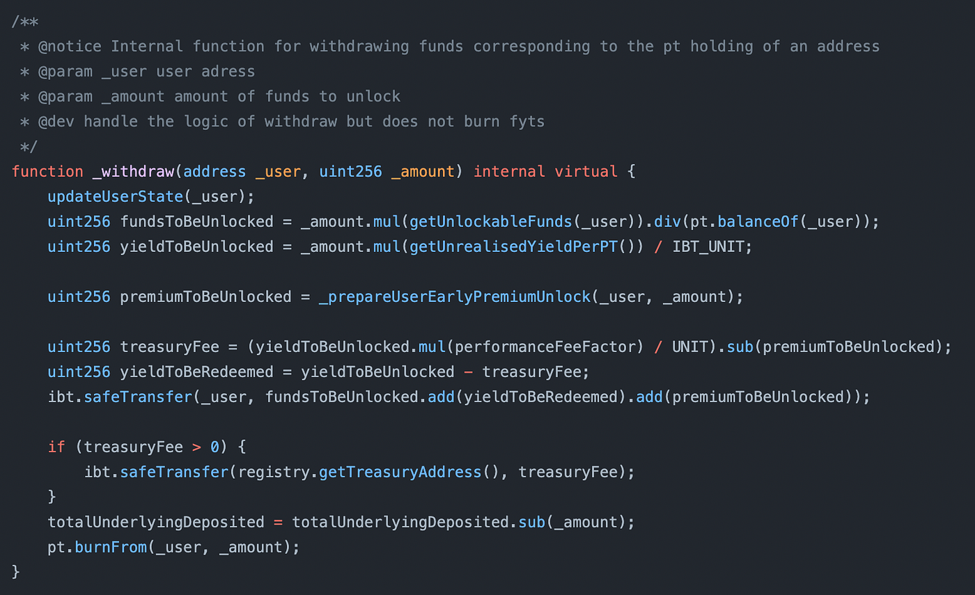 The if we see above is the most interesting part. The require check makes sure that a user can’t delegate more yield than the PTs they hold and they already delegated.