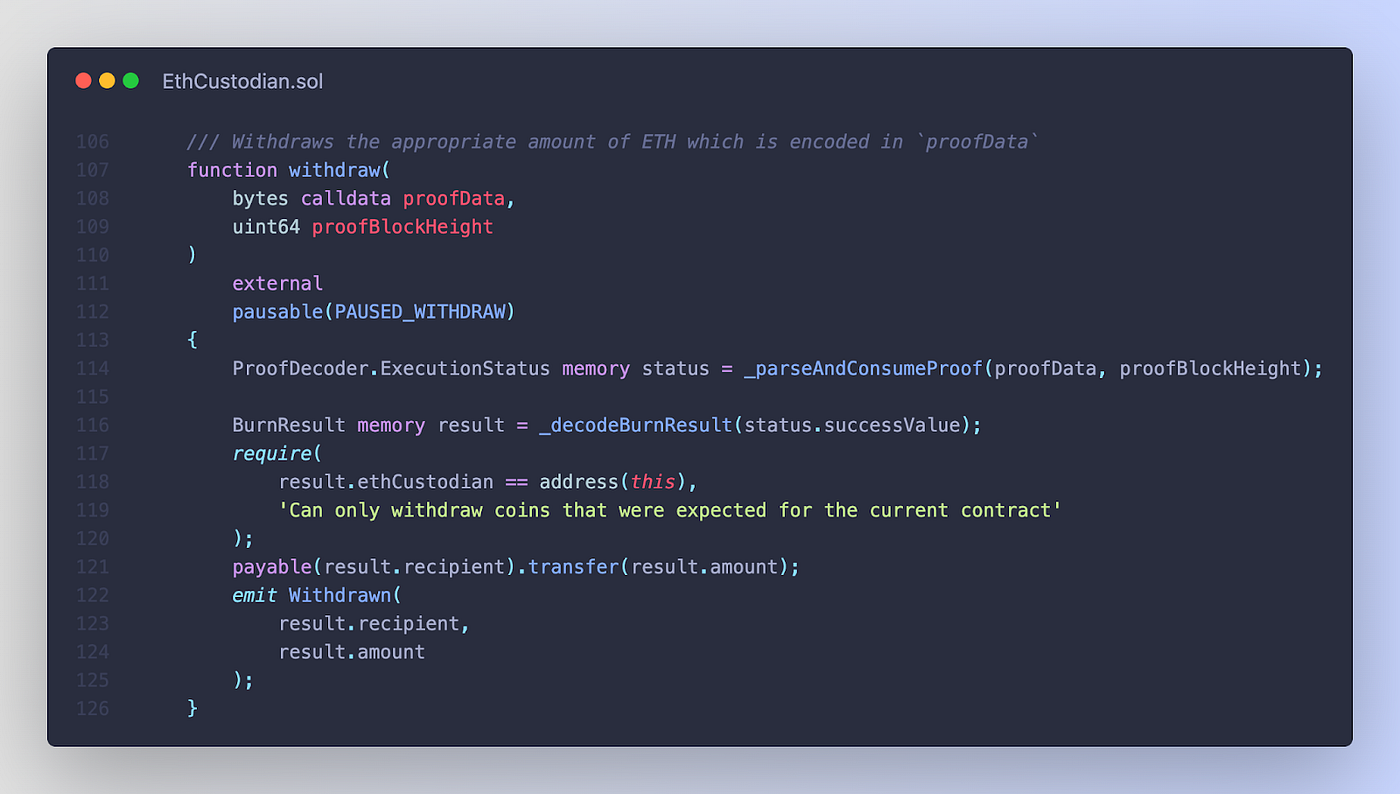Let’s focus on the transfer from NEAR/Aurora to Ethereum, as that was the vulnerable component in this bug submission. The function responsible for payouts is the withdraw