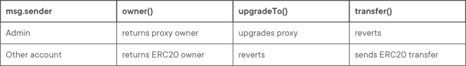 In a scenario where a user would call a function transferOwnership() which shares a name in both contracts, they can be sure that the logic from the implementation will be executed and not the proxy’s.