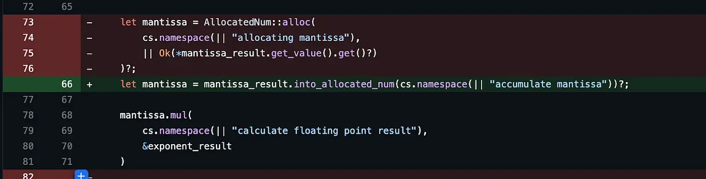 - Where the mantissa is now being created with a new method into_allocated_num to enforce constraints and ensure that the value of the mantissa is derived from the expected calculations, thereby addressing the vulnerability.