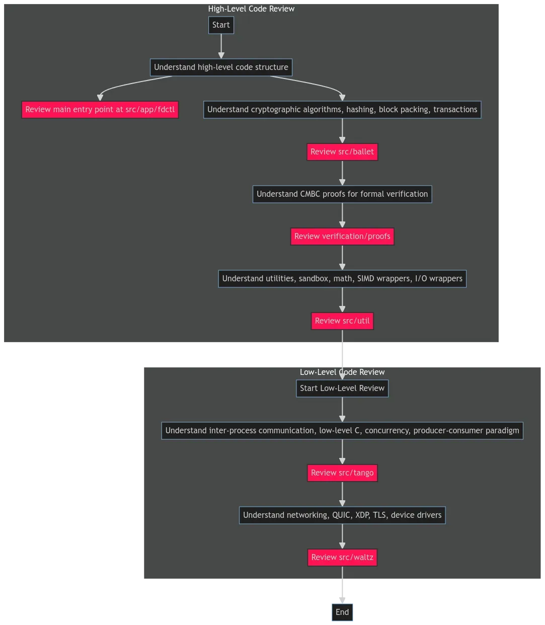 Given the complexity and size of the Firedancer v0.1 codebase, it’s crucial to focus on the areas that align with your skills and experience. Here’s how you can approach your bug-hunting journey: